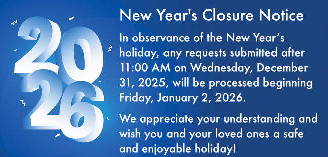 Our center will be open regular business hours on Wednesday, December 31 (New Year’s Eve) and will be closed on Thursday, January 1 (New Year’s Day). Thank you for your understanding.